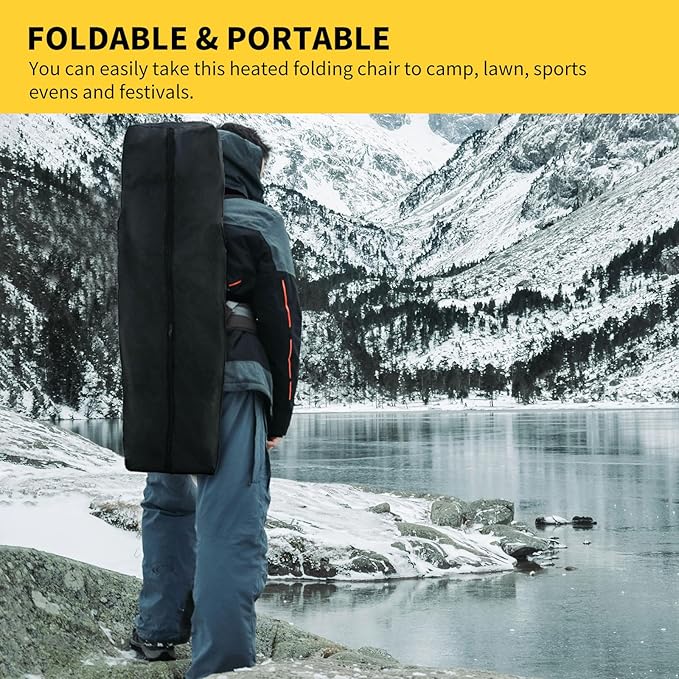 - Portable Camping Chair: Easy to fold away. No Assembly required. The heated chair has battery pack pocket and storage pockets allows you to store your USB Battery, drink and phone. Comes with a carry bag for transport and storage. Lawn chairs is good for the camping, fishing, sporting events, lawn,garden, patio, backyard, outdoor activities and leisure time.