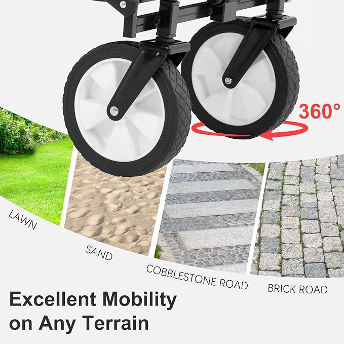 - ๐360ยฐUniversal Wheels:This collapsible wagon utility cart equipped with four 6.5" diameter all-terrain wheels, including two front wheels that can rotate 360 degrees.Our folding collapsible wagon can roll on different ground, from cement to wood floor, from stone road to sand.