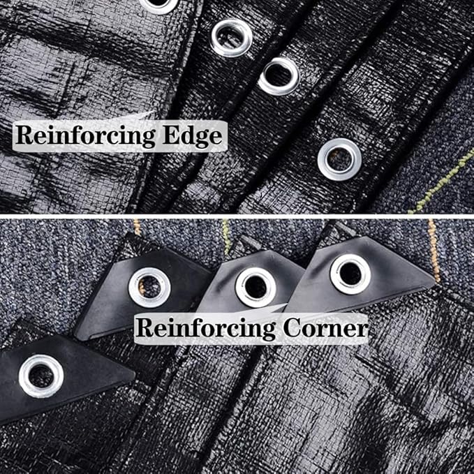 - TIE IT DOWN EASILY:12x14 Tarp with grommets, which are small rust proof aluminum rings along the edges of the tarp.These are used to attach the tarp to ropes, bungee cords, or other fasteners. The edges of outdoor tarp can be reinforced with extra layers of material to prevent tearing or fraying,making them more durable and easier to handle.PP protective layer is added to the four corners of the waterproof tarp to make the plastic tarp stronger and not easy to be damaged by pulling.