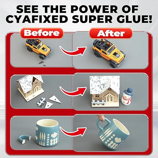 - ๐ ๏ธ Multi-Material Compatibility: Designed for versatility, CYAFIXED Super Glue bonds wood, plastic, metal, rubber, ceramic, and glass with strong power. Ideal for multi-surface repairs, from shoe soles to furniture joints, ensuring one adhesive meets diverse household and DIY needs.