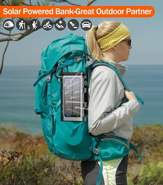 - Practical Outdoor Battery Pack: This solar portable charger has dual bright LED flashlights with 3 modes (SOS/Strobe/Steady) for power outages and other emergencies. The built-in compass clearly shows you the direction. It also comes with a carabiner, which you can hang on the backpack to charge this power bank through solar energy. It’s well-made to be waterproof/shockproof/dust-proof, suitable for various harsh environments.