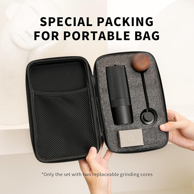- Easy to Carry and Clean - Equipped with brush and storage pocket, easy to clean and store. Just simply clean the coffee grinder after use. DO NOT washable with water. The pocket stores the coffee bean grinder and can be taken anywhere. Suitable for camping, travel, outdoor activity, coffee festival.
