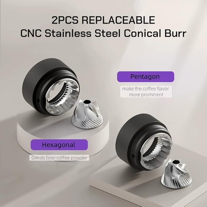 - CNC Stainless Steel Pentagon and Hexagonal Conical Burr - Hand Coffee Grinder is made of 420 stainless steel grinding core for extra durability. Double bearing center axis positioning makes grinding particles more uniform. Aluminum body for increased durability. This burr grinds coffee beans more efficiently.