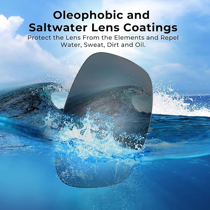 - KEY FEATURES – Oleophobic lens coating repels saltwater, oil, and chemicals - Polarized lenses reduce glare - Impact resistant PC lenses protect your eyes from flying objects – 0.86 oz Lightweight, durable, and comfortable Grilamid frames – Adjustable anti-slip nose and temple pads - Block 100% of the harmful UVA and UVB rays – Aggressive and Stylish design for outdoor activities