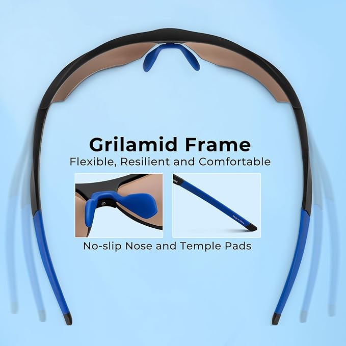 • KEY FEATURES – Oleophobic lens coating repels saltwater, oil, and chemicals - Polarized lenses reduce glare - Impact resistant PC lenses protect your eyes from flying objects – 0.86 oz Lightweight, durable, and comfortable Grilamid frames – Adjustable anti-slip nose and temple pads - Block 100% of the harmful UVA and UVB rays – Aggressive and Stylish design for outdoor activities