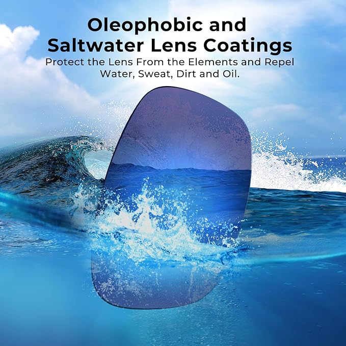 - KEY FEATURES – Oleophobic lens coating repels saltwater, oil, and chemicals - Polarized lenses reduce glare - Impact resistant PC lenses protect your eyes from flying objects – 0.86 oz Lightweight, durable, and comfortable Grilamid frames – Adjustable anti-slip nose and temple pads - Block 100% of the harmful UVA and UVB rays – Aggressive and Stylish design for outdoor activities