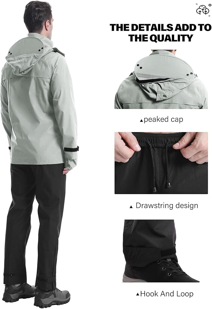 - Design: The rain suit has a removable brim, adjustable hook and loop cuffs and hidden sleeves. The jacket has a high neckline so you can tuck your hood in when you don't need it. The pants have adjustable hook and loop leg, full elastic waistband and drawstring