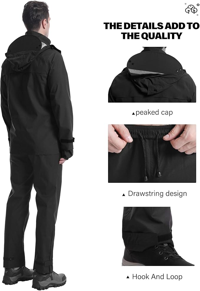 • Design: The rain suit has a removable brim, adjustable hook and loop cuffs and hidden sleeves. The jacket has a high neckline so you can tuck your hood in when you don't need it. The pants have adjustable hook and loop leg, full elastic waistband and drawstring