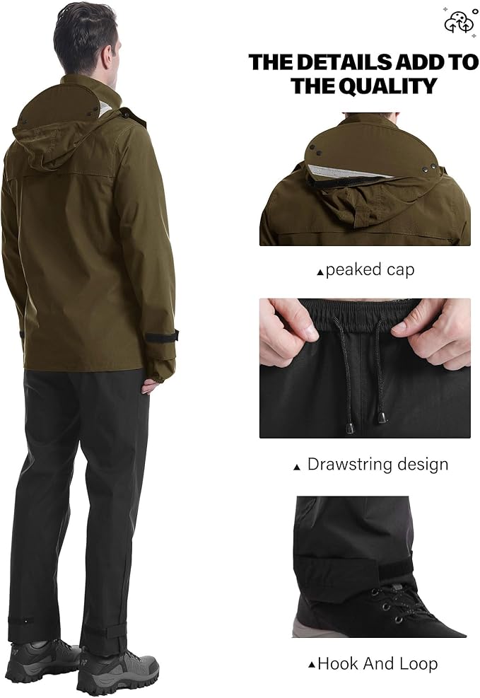 - Design: The rain suit has a removable brim, adjustable hook and loop cuffs and hidden sleeves. The jacket has a high neckline so you can tuck your hood in when you don't need it. The pants have adjustable hook and loop leg, full elastic waistband and drawstring