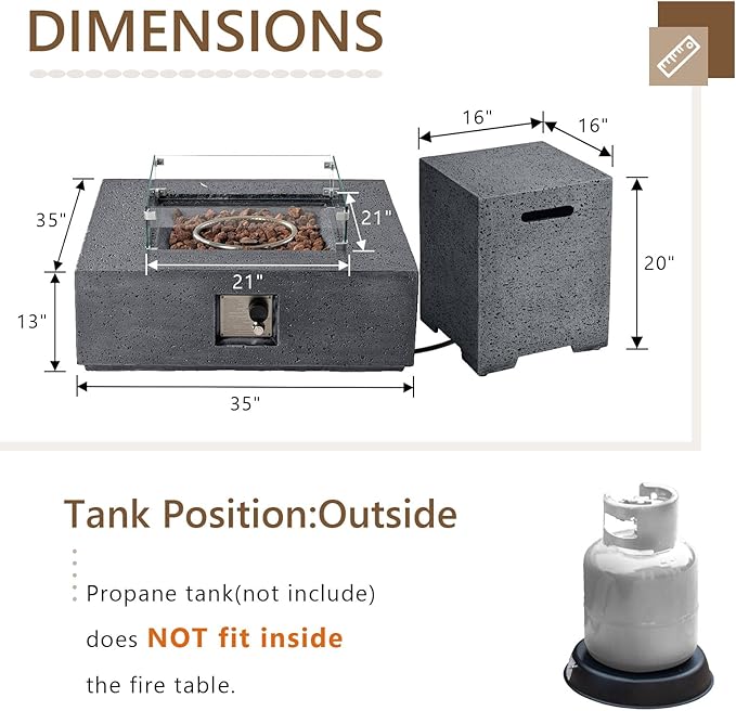 - ๐ฅใSpacial Economyใ: Large enough coffee table surface to set your coffee or nightcap. The entire piece can easily be picked up from the side handles by two people. It fits a 20lb propane tank which should be put outside the fire table.