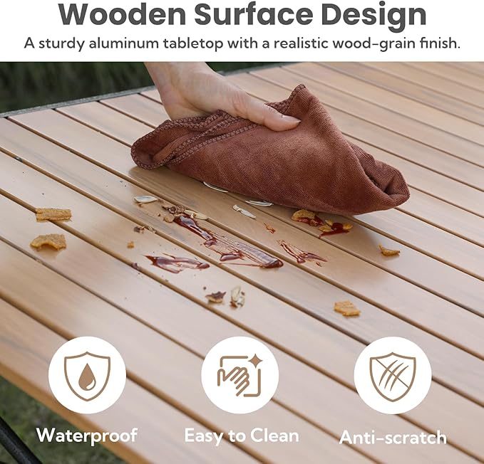 - Easy to Clean: The painted aluminum tabletop is waterproof, dirt-resistant, and rust-resistant. It is easy to clean and will not fade. Watermarks and oil stains will not be absorbed, so you can rinse and wipe it directly with water without affecting the appearance or durability of the folding table.