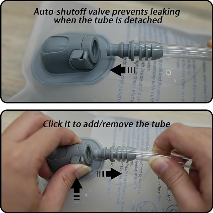 - UPGARDE LEAK PROOF: Soft yet durable mouthpiece with easily accessible ON/OFF valve prevents leakage. You can control the water flow by biting, First pull up on the drinking cap, gently bite the mouthpiece with your front teeth to have a sip and start drinking, push back to stop water flow. Quick-release tube is detachable. Auto shut off while the tube is removed, The hydration bladder will stay filled non-leaking. The bladder bags also has a dust cover to keep dirt out.