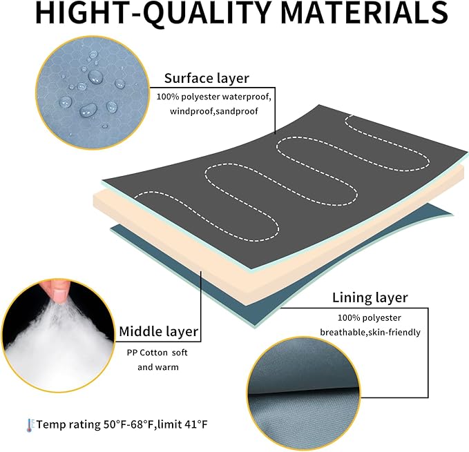 - Comfortable Sleeping Experience:Our sleeping bag can be used in 3 seasons with a design optimal comfort temperature of 59℉,temp rating 50°F-68°F.This lightweight sleeping bag is perfect for weather camping trips in Spring through to Autumn.Give you a comfortable sleep after a day of adventure outdoor camping, backpacking, hiking, and outdoor travel.
