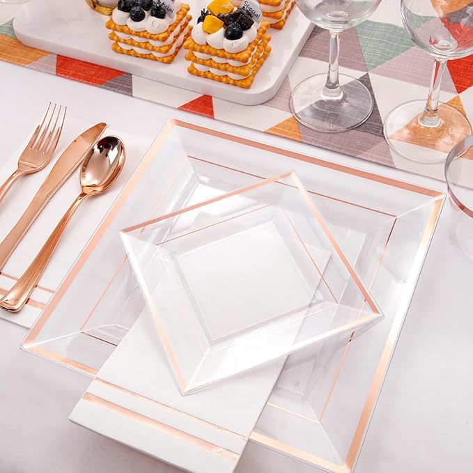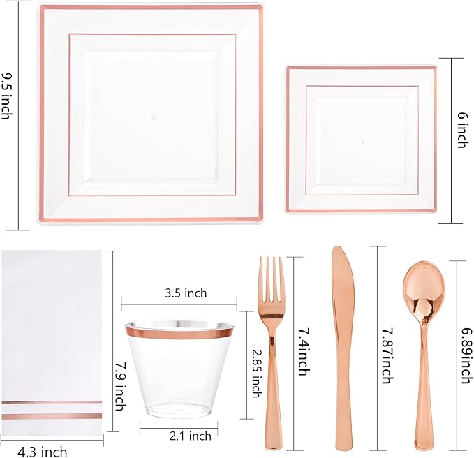 - VALUE SET: This rose gold plastic plates set includes 50pcs 9.5" clear rose gold dinner plates, 50pcs 6" clear rose gold dessert plates, 50 sets of rose gold plastic silverware, 50pcs rose gold rim cups and 50pcs 13*15.7 inches (unfolded size) napkins, our clear and rose gold disposable plates solve everything you need for dining, making it easy for you to hold a party and enjoy a good time.