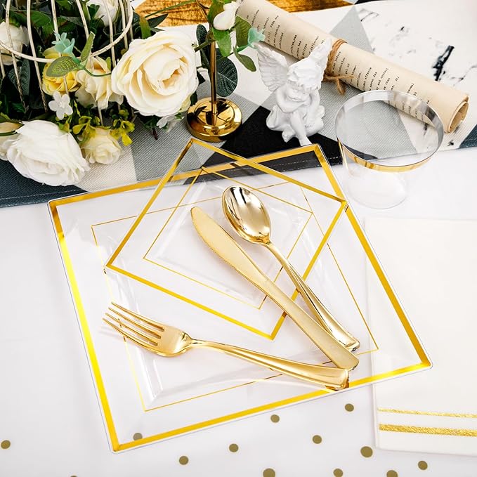 Festiva 176Pcs Clear and Gold Plastic Plates - Square Clear Plates with Gold Trim - Dinnerware Set for 25Guest include Cups Cutlery Napkins for Thanksgiving Party&Wedding&New Year