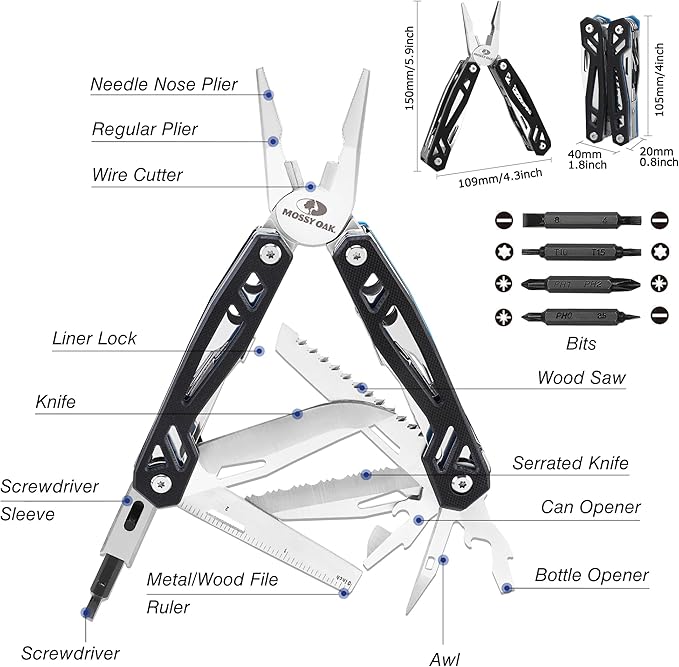 - 21-in-1 Function - The multi tool includes needle nose pliers, regular pliers, wire cutters, magnetic hexagon sleeve, screwdriver, knife, scale, metal/wood File, serrated knife, bottle opener & slotted screwdriver, wood saw, leather punch, 8-in-1 bit set and more