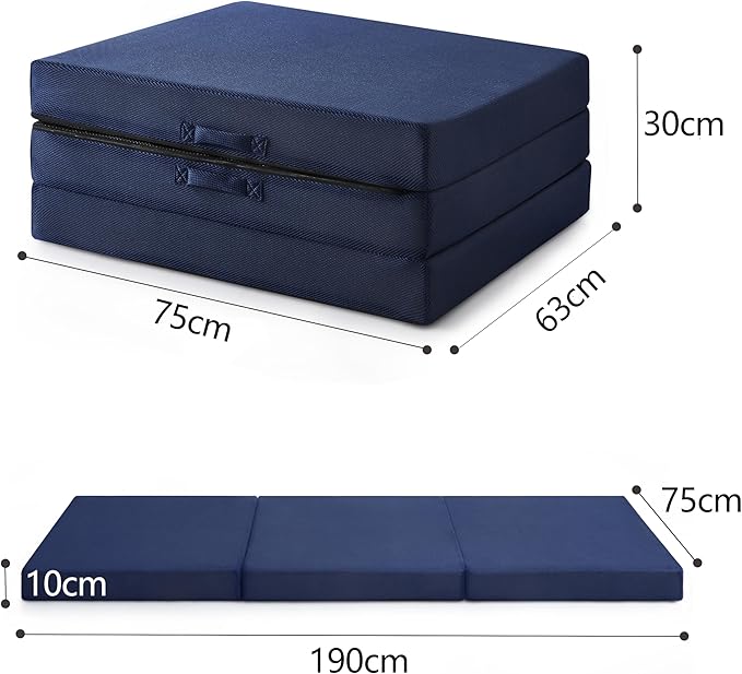 - 【Multifunctional Foldable Mattress】Portable trifolding mattress are perfect for temporary guest sleeping beds, van or SUV trips, children playing and camping.You will Love the efficiency of being able to open up and set up in less than 5 minutes.Mattress in flat position measures 75" x 30" x 4". When folded it measures 25" x 30" x 12".