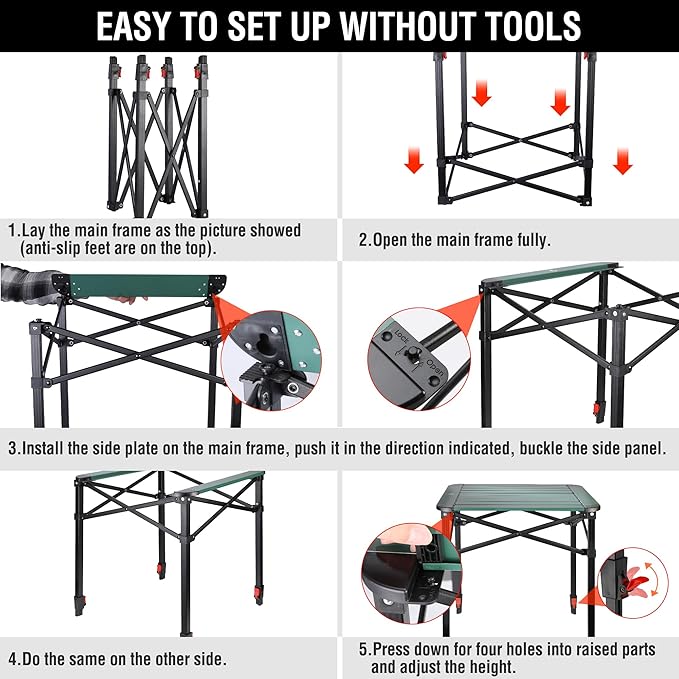 - Easy to Set-Up: With no tools required, this folding camping table is simple to set up, making it ideal for picnics, backyard barbeques, and camping trips. Suitable for all types of camping chairs and stools, its adjustable height makes it versatile