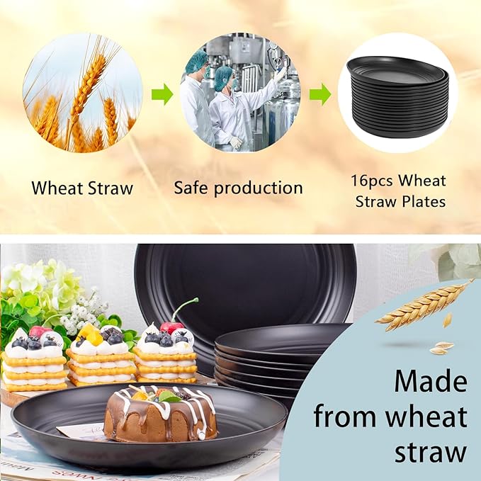 Supernal 16pcs Black Wheat Straw Plates,10 inch Unbreakable Dinner Plates,Reusable Plastic Plates,Dishwasher & Microwave Safe,Lightweight Dinnerware Plates Set for Kitchen,Camping