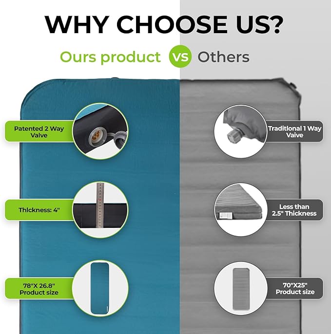 - All-Season, All-Terrain Comfort: From summer nights under the stars to chilly autumn getaways, this self-inflating pad is built for all seasons and terrains. Waterproof, thick, and durable enough to withstand uneven or rocky ground, it ensures warmth, dryness, and comfort no matter the conditions. Ideal for tents, car camping, hiking, home guests, or even emergency use - this pad is your reliable companion, wherever you rest.