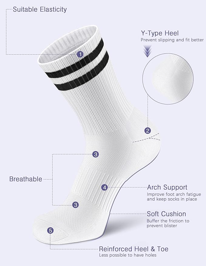 - [FULL CUSHIONED SPORT SOCKS]: Crew socks provide better support, constructed with soft plush sole cushioning for extra durability and softness in high-wear areas, reduce the impact on the knee. Elastic arch support and mesh top design are provided with proper compression force, meanwhile, can also keep in good air permeability. Comfortable seamless toe ensures protection against yarn chafing and irritation caused by traditional toe seams.