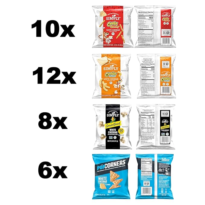 - Includes (12) Simply Cheetos Puffs White Cheddar, (10) Simply Cheetos Crunchy White Cheddar, (6) PopCorners White Cheddar, & (8) Simply Smartfood White Cheddar