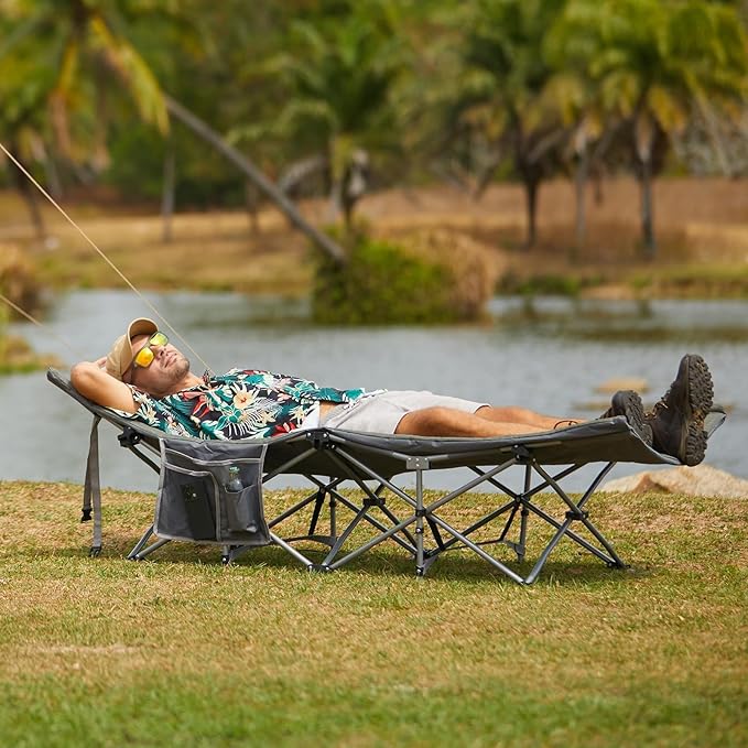 FUNDANGO Camping Cot for Adults, Padded Camp Cots for Sleeping Portable Camping Bed for Outdoor Travel Folding Cot Heavy Duty with Carry Bag, Gray