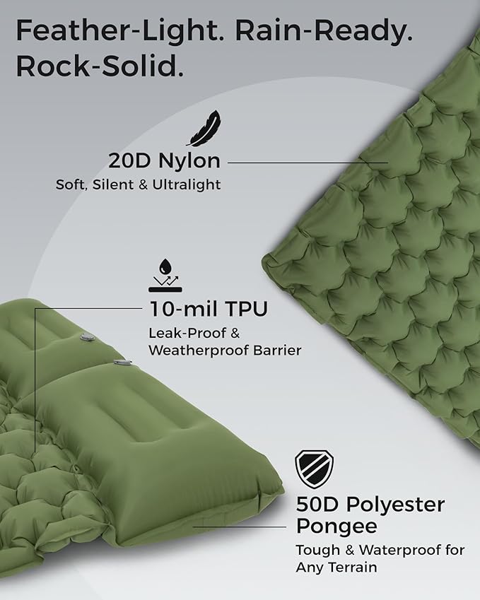 - 20D Nylon Top + 50D Polyester Pongee Bottom – Lightweight Comfort Meets Rugged Durability: Our top layer uses 20D nylon laminated with 10-mil TPU, creating a lighter, quieter surface than the 40D nylon found in many pads—helping cut weight without losing comfort. The bottom features 50D polyester pongee, highly water-resistant to block moisture and tough enough for rough terrain. This dual-layer build delivers soft comfort above and durable protection below, ideal for outdoor use.
