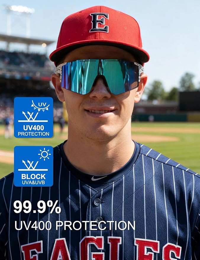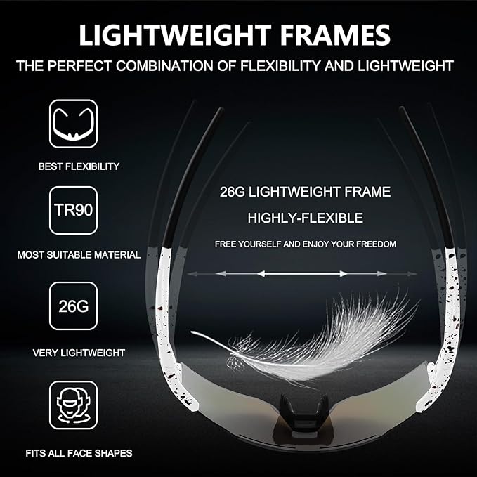 - LIGHTWEIGHT DESIGN:Our sports sunglasses made of durable and strong frame and uv protection lens lightweight design,weighs only 25 g that you can’t feel you was wearing it;The frame can bend under pressure and contour your face comfortably;Ideal for usage by motorcycle ,cycling, driving, running, baseball,fishing, racing, golf and climbing, trekking or other outdoor activities