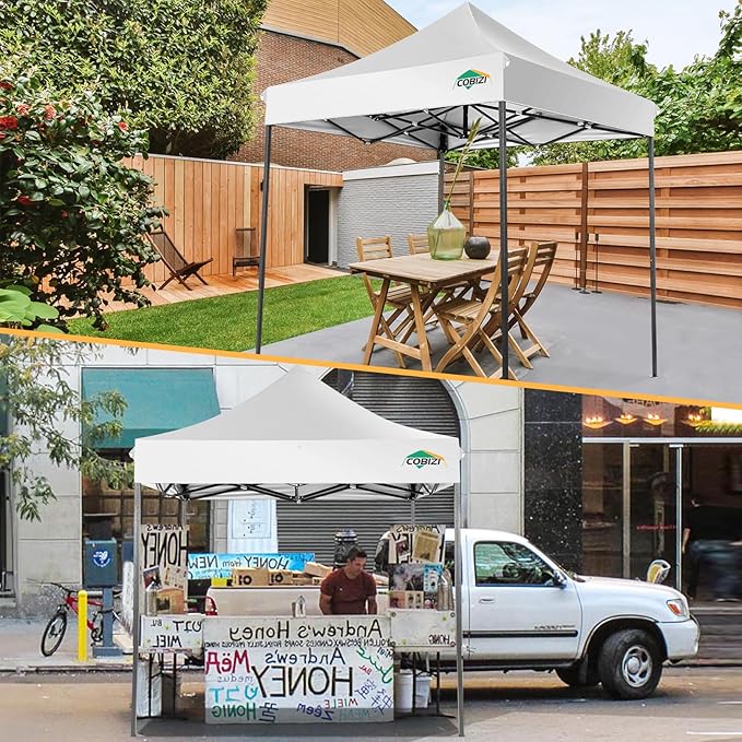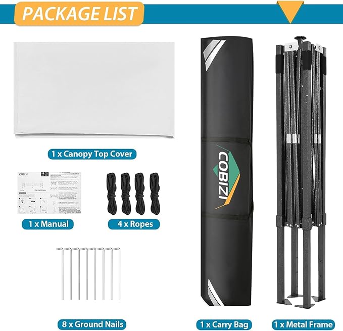 - 【43 SQ Feet Shade Area】COBIZI 6.6x6.6 pop up tent provides 43 SQFT spacious covered space, it can easily accommodate 3-5 people, meet your different needs for holding small gatherings. Perfect for wedding, birthday party, market event and other small events. When in use, always secure the 6.6x6.6 pop up tent with the included stakes and ropes to avoid damage. One year after-sale protection for canopy frame; Six months after-sale protection for fabrics and accessories.