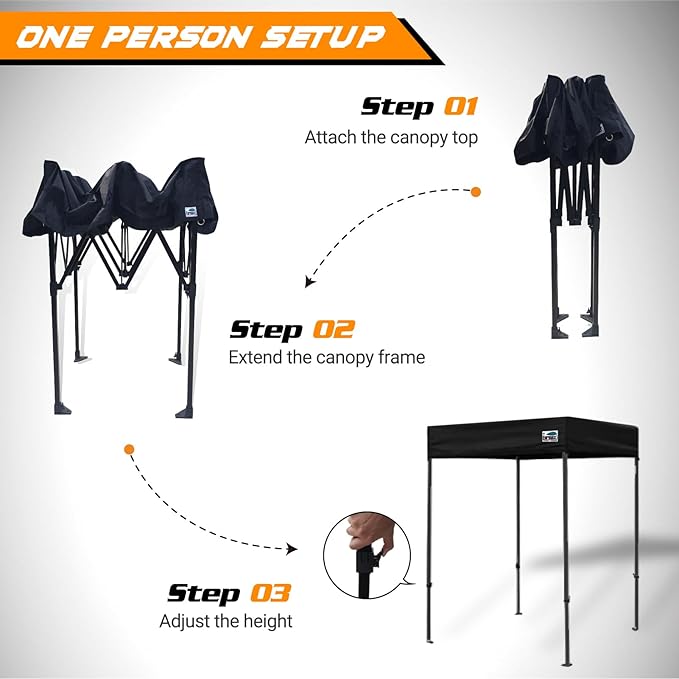 - 5x5 Commercial grade canopy tent frame: (1)Strong full truss structure design. (2)Hammertoe powder coated finishing. Good looking and rust resistance. (3)Three height positions, latest thumb latch lock system, smooth and safe push buttons sliders, easy to lock and release.