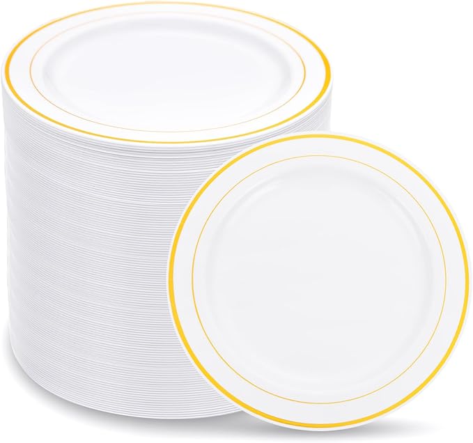 - What's You Get:Our gold and white plastic plates set contains 144 pieces of 7.5 inch dessert plates. You can simply throw away the gold cake plates after use, so you don't have to worry about dishwashing and cleaning up after your event.