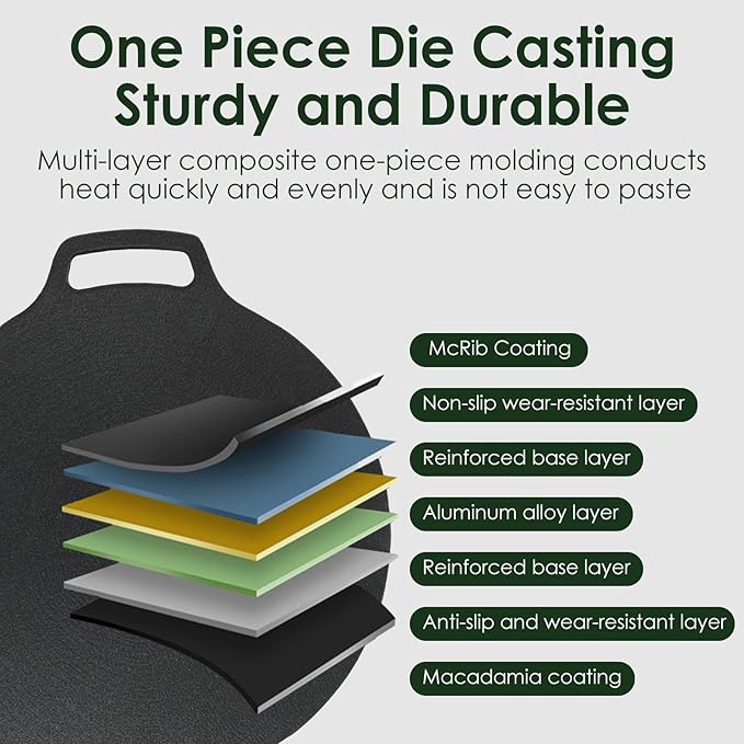 - CAST ALUMINUM ALLOY MATERIAL: The grill pan is made of high quality solid die-cast aluminum alloy with 6 layers of food grade safe non-stick coating, durable and easy to clean, it's a must-have cookware for lovers of frying and grilling food.