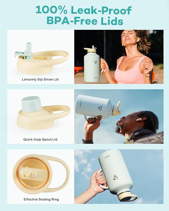 - No Leakage, No Spills: Our stainless steel water bottles comes with a dust-proof flip straw lid and a spill-free spout lid, both 100% leak-proof and spill-proof. The two lids showcase a vibrant color-contrast design, harmonizing with the bottle body's color and adding an extra touch of allure.