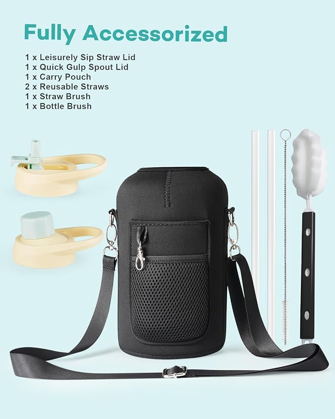 - Hassle-Free Experience: Included with 2 lids, 2 straws, 1 straw brush, 1 bottle brush, and 1 carrying pouch, Topre water jug is fully accessorized to handle any tricky situations. Just choose your style from three capacities (40/64/128).