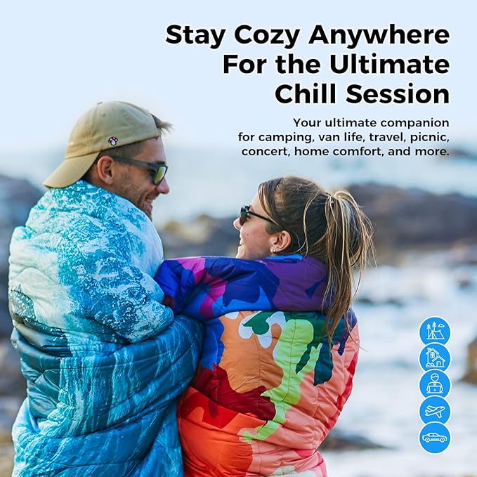 - WEARABLE DESIGN - HANDS-FREE COMFORT: This camp blanket features snap buttons and corner loops, easily transforming into a wearable shawl or cape. Stay cozy and mobile while walking the campsite, watching outdoor games, or relaxing by the fire. The 79"L × 57"W size and connectable design comfortably wrap two people—perfect for shared adventures and hands-free warmth.
