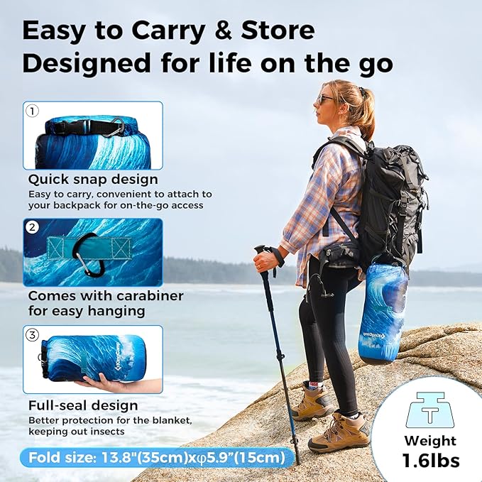 - LIGHTWEIGHT & PORTABLE - WARMTH ON THE GO: This camping blanket unfolds to a spacious 79"L × 57"W and weighs only 1.63 lbs-lighter than a bottle of water. It offers full coverage without the bulk. It compresses down to 13.8" × 6.7" × 6.7" in the included double-drawstring stuff sack, making it the ideal packable blanket for travel, backpacking, hiking, or road trips. Stay warm anywhere, anytime.