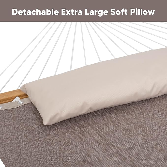 - Quick Dry & Comfortable: This double hammock bed is made of Textilene & Olefin which is more breathable, comfortable. The new upgraded fabric is easy to clean and dry. A polyethylene-stuffed head pillow offers superior comfort. You can even set your preferred height by hooking the suitable chain section to the holes on the stand