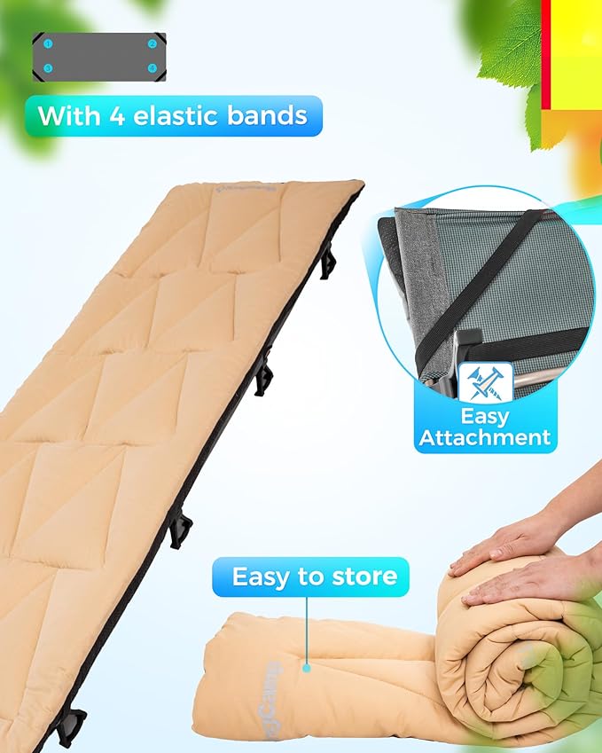- SECURE FIT WITH ELASTIC STRAP DESIGN: The four elastic straps at each corner of the mattress pad help keep it securely attached to your cot. Say goodbye to restless nights and slipping pads. Whether you're resting in your tent, at a campsite, or indoors, this cot pad will stay in place for an uninterrupted night of sleep.