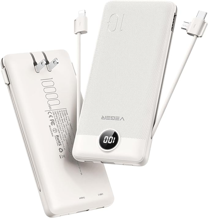 - 【Portable Charger with Built in Cables &Plug】 VEGER 10000mAh Portable Charger, with built-in USB-C , other cable for iPhone, and a Wall Plug for recharging the power bank itself, you can say goodbye to carrying adapters and cables when travel.