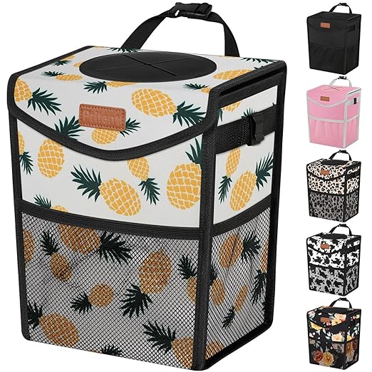 Car Trash Can with Lid, Cute Leakproof Car Trash Garbage Bag Hanging Vehicle Trash Bin Small Portable Automotive Garbage Cans Organizer for Back/Front Seat/Console(2.8 gal,Pineapple Print