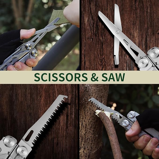 - 17-IN-1 Multitool kits: A lots of tools included: Needle-nose plier, Regular plier, Hard wire/ Soft wire cutter, Wire stripper, Knife blade, Large/Small slotted screwdriver, Can/ Bottle opener, Saw, File, Scissor, Ruler in/cm, awl with sheath