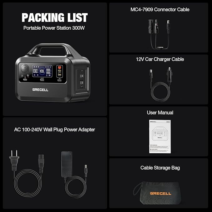 GRECELL Portable Power Station 300W, 230Wh LiFePO4 (LFP) Battery, 1.5hrs Fast Charging, 2 Up to 300W(Peak 600W) AC Outlets, Solar Generator for Outdoor Camping/RVs/Home Use