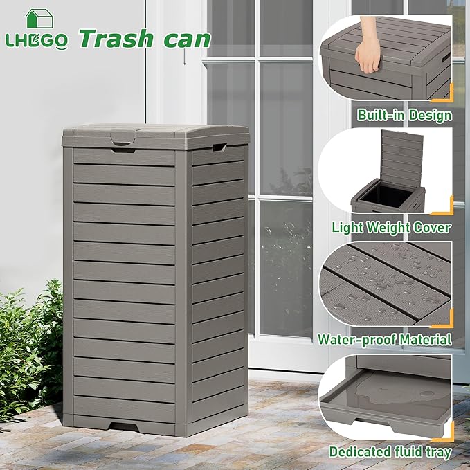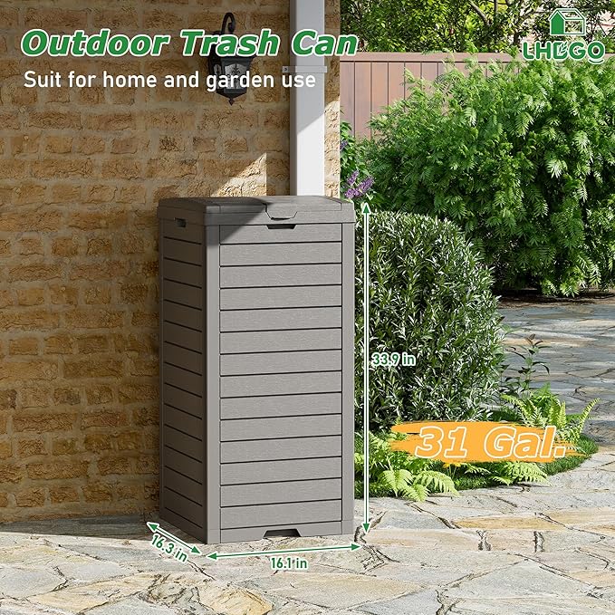 - 31 Gal Capacity - 16.10×16.26×33.86 in, compatible with 33–40 gallon trash bags (43~47"L × 28~30"W). This outdoor trash can is suitable for storing both indoor and outdoor trash