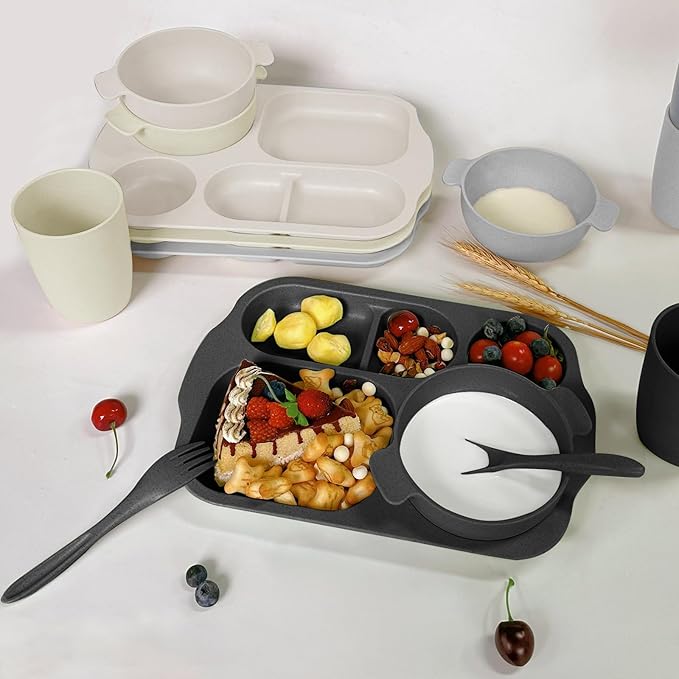 shopwithgreen Kids Toddlers Plates and Bowls Sets, 20 PCS Wheat Straw Dinnerware Cutlery Set, Unbreakable Tableware Divided Plate Spoon Knife Cup, Reusable Utensils Set for Kitchen Picnic School