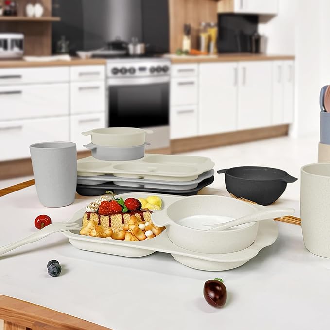 - 【Why Buy Everything Separately?】This unbreakable dinnerware cutlery set includes 20PCS (4 x wheat straw divided plates- 11.8L x8.1W", 4 x 6.1W" wheat straw kids bowls, 4 x 12oz wheat straw cups- 3"W x 4"H, 4 forks and 4 spoons). Each set comes in 4 beautiful colors. Give you a perfect set of matching designs and colors with its smooth round edges and modern style.