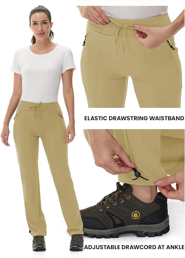 • Adjustable drawstring waistband for a custom fit: These travel pants feature a wide elastic waistband with a drawcord, allowing you to adjust the fit to your liking. The slim fit and 4-way stretch fabric ensure maximum comfort and freedom of movement during any outdoor activity.