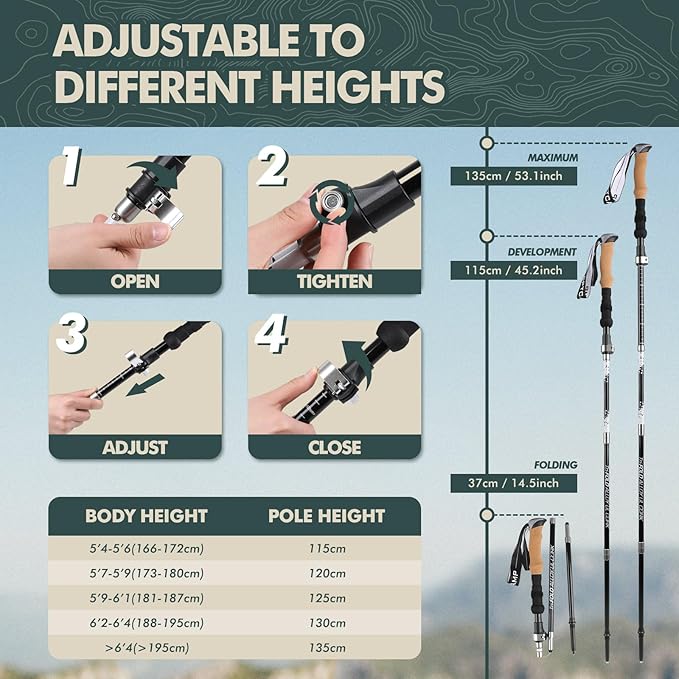 - [PEAK ADAPTIVITY OF ALL HEIGHT AND TERRAIN] Easy to unfold and adjust the length from 45" to 53" to fit your height. Our trekking Poles come with snow plates, mud plates, nordic walking buffer tips, rubber tips and the sporty bag for both hiking sticks and all parts to stay together