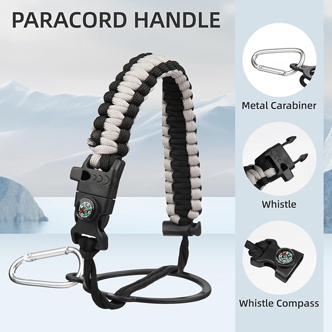 - The large capacity gallon water jug comes in various sizes, including 50 oz, 64 oz, 87 oz, and 128 oz, with a range of colors to choose from according to your need. All sizes of bottles equip with a paracord handle and a pouch for easy carrying