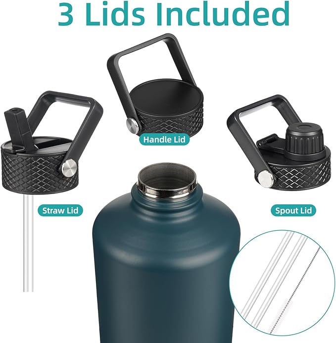 - The water bottle comes with 3 lids for different beverages, a sip lid for hot drinks, a straw lid for iced beverages, a flex-removable lid(2 different handle lids ship at random) for smoothies or fruit drinks. All lids are BPA-free, leak-proof, and dust-proof, catering to your need